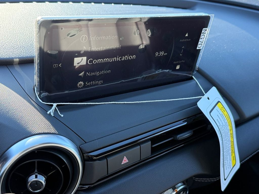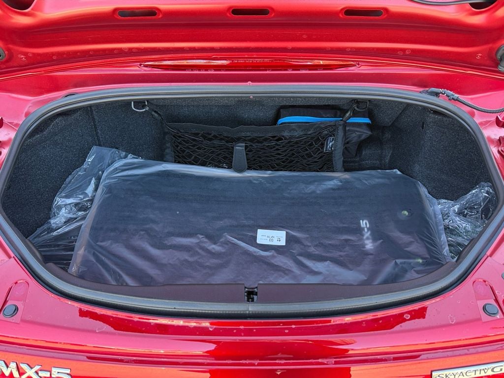 ', 4-Wheel Disc Brakes, 9 Speakers, ABS brakes, Air Conditioning, Alloy wheels, AM/FM radio: SiriusXM, AppLink/Apple CarPlay and Android Auto, Auto High-beam Headlights, Auto-dimming door mirrors, Auto-dimming Rear-View mirror, Automatic temperature control, Brake assist, Bumpers: body-color, Convertible roof lining, Convertible roof wind blocker, Delay-off headlights, Driver vanity mirror, Dual front impact airbags, Dual front side impact airbags, Electronic Stability Control, Emergency communication system: MAZDA CONNECT, Exterior Parking Camera Rear, Four wheel independent suspension, Front Bucket Seats, Front Center Armrest, Fully automatic headlights, Garage door transmitter: HomeLink, Glass rear window, Heated door mirrors, Heated front seats, Illuminated entry, Leather Shift Knob, Low tire pressure warning, Navigation System, Occupant sensing airbag, Outside temperature display, Panic alarm, Passenger vanity mirror, Power door mirrors, Power steering, Power windows, Radio data system, Rain sensing wipers, Rear anti-roll bar, Rear window defroster, Remote keyless entry, Speed control, Speed-sensing steering, Sport steering wheel, Steering wheel mounted audio controls, Tachometer, Telescoping steering wheel, Tilt steering wheel, Traction control, Trip computer, and Variably intermittent wipers.